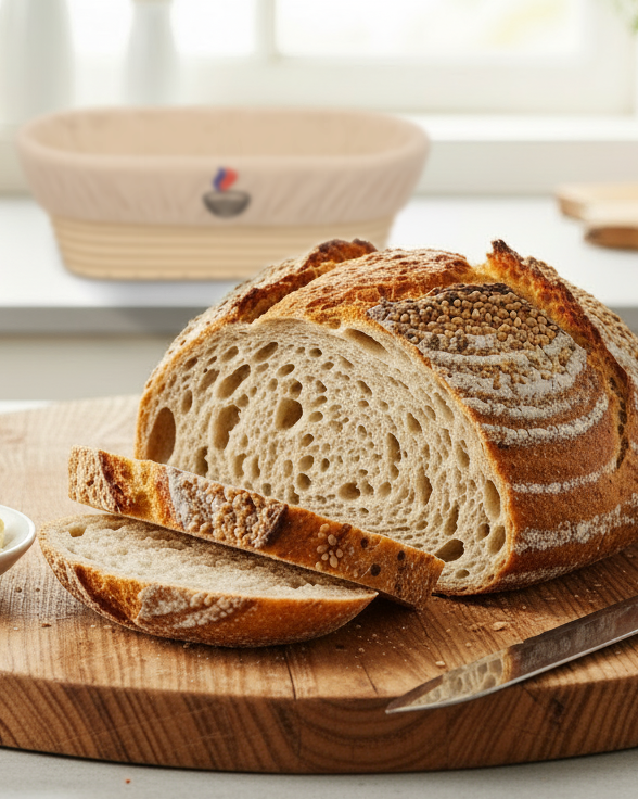 - Shape: Form dough into a batard, place seam-side up in a seeded, floured banneton.
